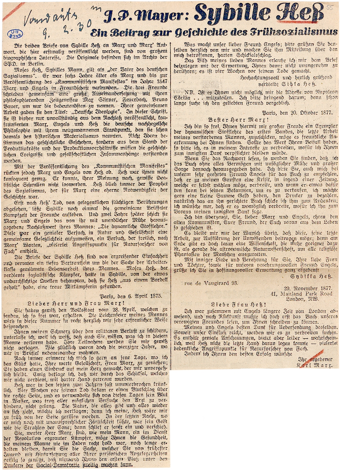 She died in Paris on November 8, 1903. Clara Zetkin praised her as a remarkable woman who was proud of being Hess’s partner and learning from him. Sibylle is remembered for her responsible management of Hess’s legacy, notably publishing the first volume of his „Dynamic Theory of Matter“ despite significant challenges. Unlike Heine’s widow, Sibylle actively engaged with her husband’s intellectual pursuits and continued their shared work after his death.